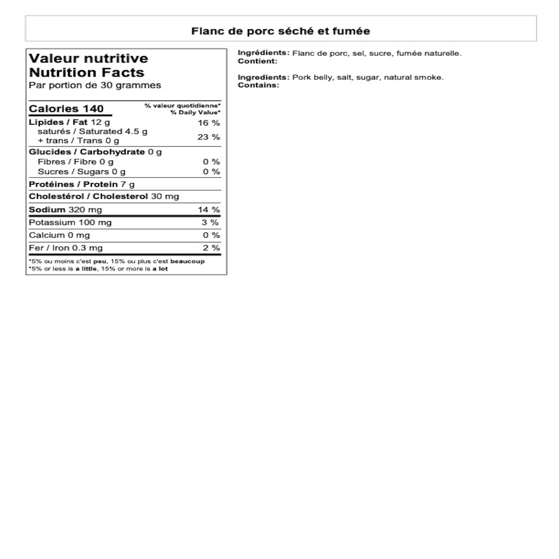 Ce bacon-flanc est vieilli 65 jours, puis délicatement fumé et séché pour développer une saveur riche et une texture fondante. Un équilibre parfait entre douceur et notes fumées, idéal pour les amateurs de charcuterie traditionnelle.