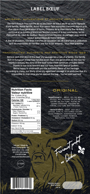 La recette originale de Label Bœuf, fumée lentement au bois naturel, relève la richesse du bœuf avec un assaisonnement équilibré. Un goût franc, authentique et savoureux qui plaît à tous les palais.